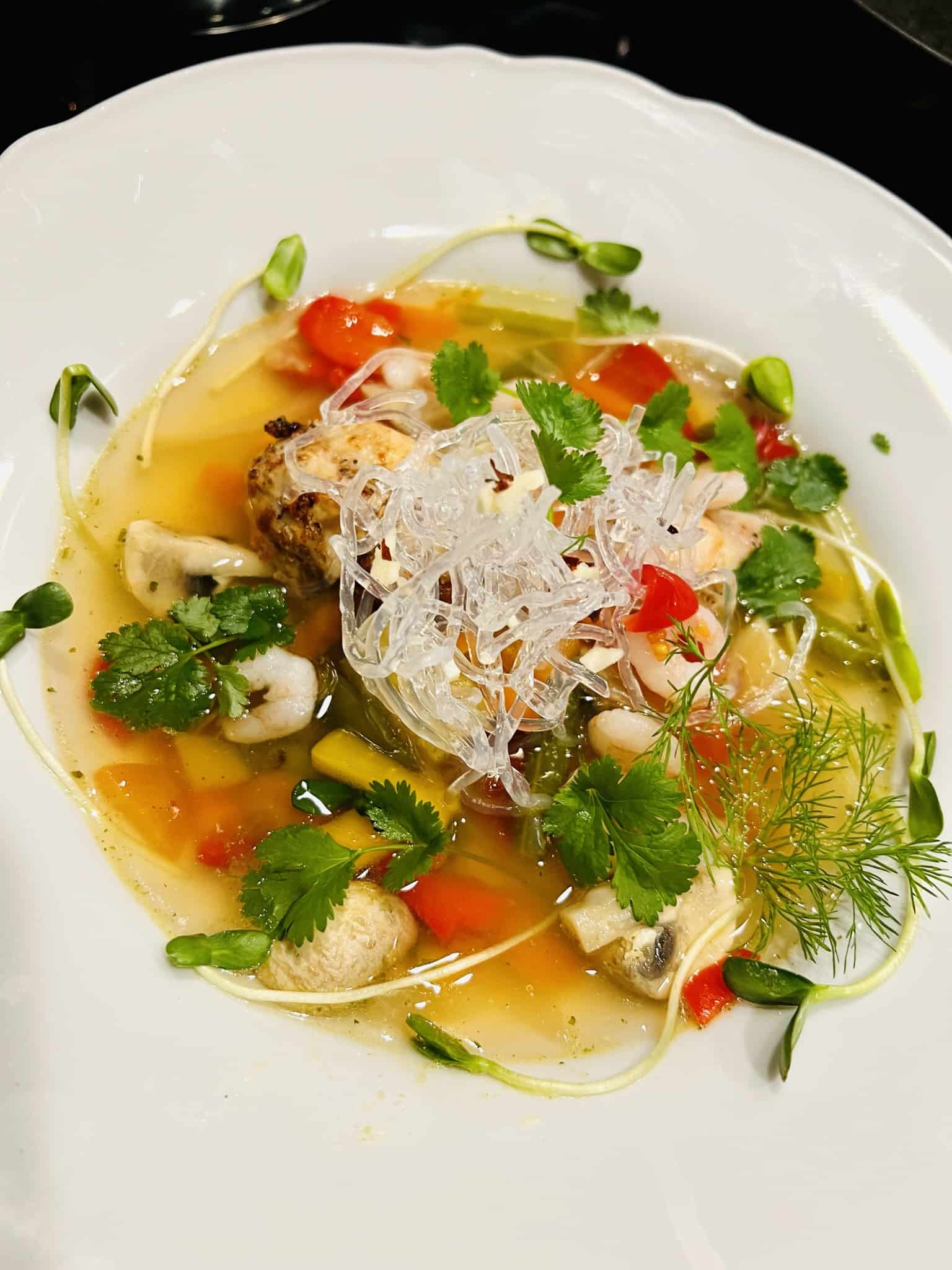 En Ramen soppa med sjögräsnudlar Så himmelskt god och enkel att tilllaga 1 liter Vatten1 svampbuljong 1 fiskbuljong250 gr wokgrönsaker5 champinjoner2 kyckling ben citronpeppar och salt1 näve sjögräsnudlar/ port ärtskott koriander Chiliflingor 1Sätt ugnen på 175...